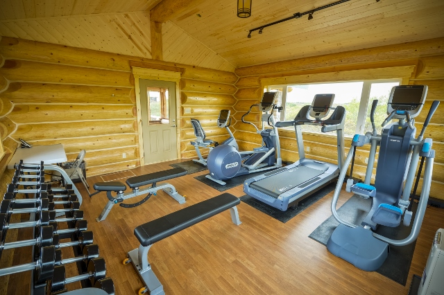 - Fitness center with free weights, elliptical, Stairmaster, recumbent bike, and treadmill